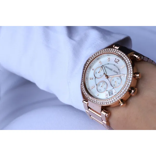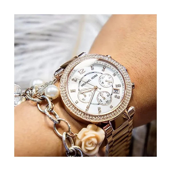 A Michael Kors Parker MK5491 elegáns női karóra azoknak készült, akik a kifinomult megjelenést és a praktikus funkciókat egyszerre keresik. A rózsaarany színű tok és szíj, a fehér számlap, valamint a finom kristályos díszítés igazán nőies és luxus hatást kelt, így remek választás mindennapi viselethez és alkalmi öltözékhez is.