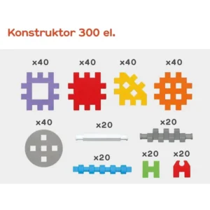 • 300 db, 3,5 × 3,5 × 0,5 cm méretű elem vidám, élénk színekben