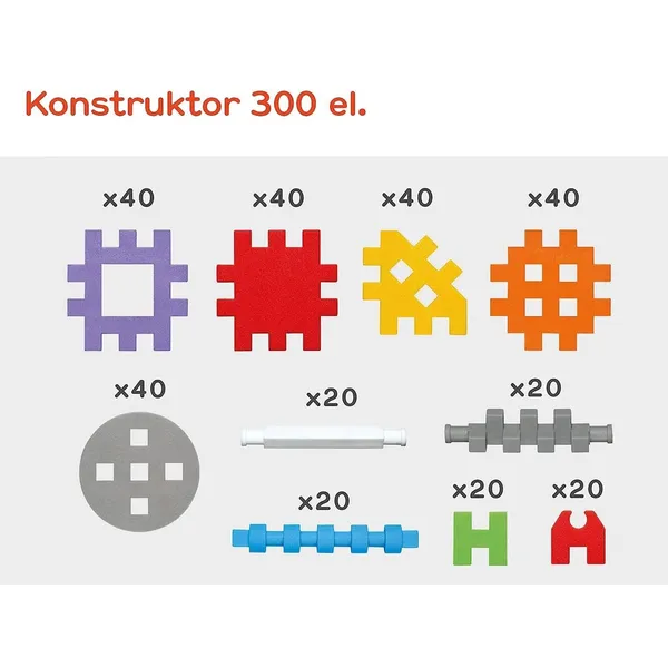 Rugalmas, puha elemeivel a készlet végtelen számú 2D és 3D alkotást kínál, miközben fejleszti a finommotorikát, a problémamegoldást és a térbeli képzelőerőt. Könnyen tisztítható, mosógép- és mosogatógépálló, a mellékelt ötletfüzet pedig folyamatos inspirációt biztosít, így a játék mindig higiénikus, praktikus és izgalmas marad.