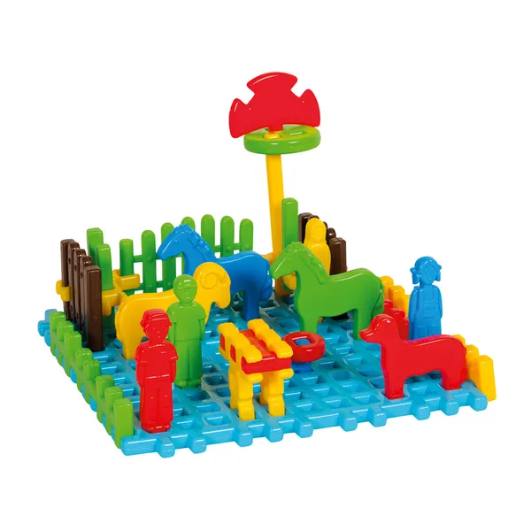 • 31 elem: 4 állatfigura, család (apa, anya, fiú, lány), 37×37 cm alaplap, építőelemek