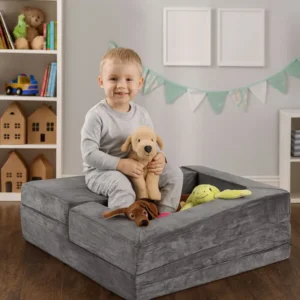 A 4 elemből álló, modulárisan átalakítható gyermekkanapé játékhoz és pihenéshez egyaránt ideális, puha habszivacs párnákkal. Levehető, mosható huzata és 80 kg teherbírása révén tartós, higiénikus megoldás a gyerekszobába.