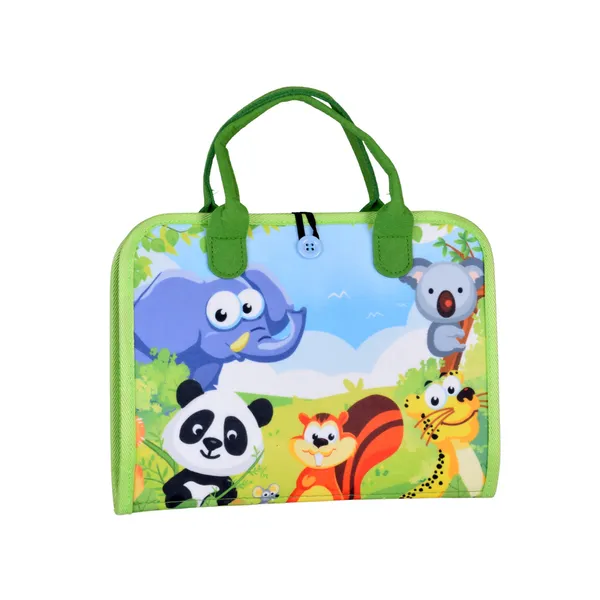 A cipzárnak köszönhetően a belső oldalak könnyen kivehetők, így külön-külön is játszhatók – ideális otthonra, utazáshoz vagy sétához. A könyv gumipánttal és gombbal záródik.