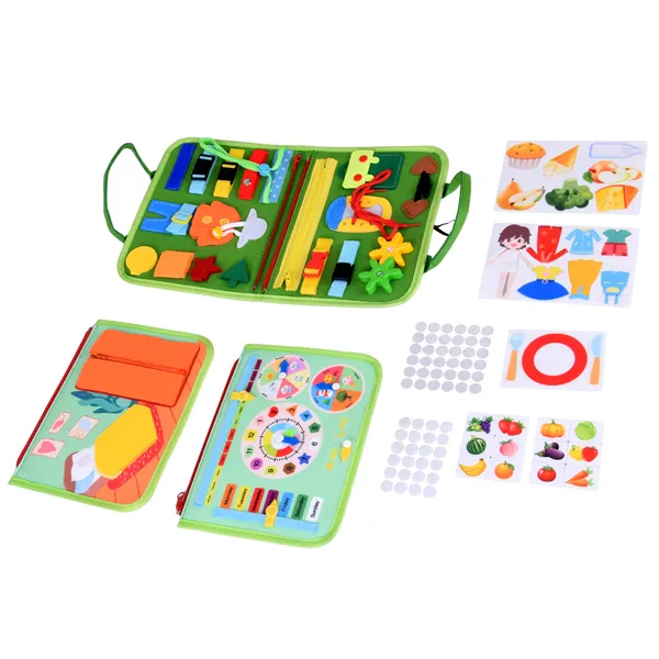 Egy igazán izgalmas, Montessori szemléletű foglalkoztató filc könyv: 6 oldalnyi játék és tanulás, tele színes, mozgatható elemekkel. A különböző tapintható, rögzíthető és levehető részek bevonják az érzékeket, fejlesztik a finommotorikát, és játékosan támogatják az önállósodást. A borítón kedves állatminta, a hátoldalon ábécé található.