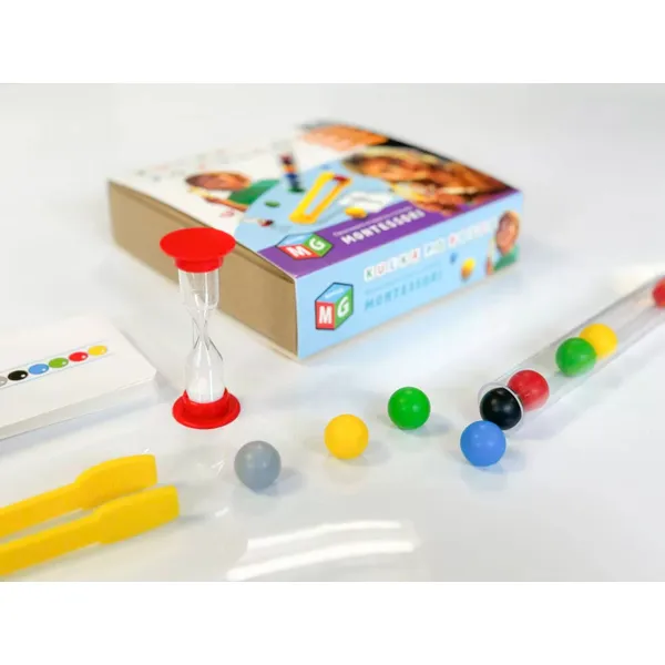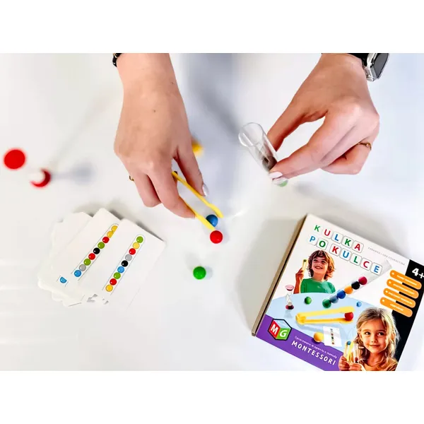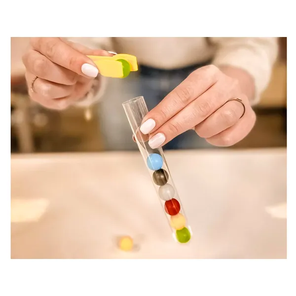 A játék lényege, hogy a színes golyókat ügyesen fel kell venni a csipesszel, majd egy kémcsőbe helyezni. Játszható szabadon, vagy a mintakártyákon látható sorrendek pontos lemásolásával. Ez a tevékenység fejleszti a precizitást, a türelmet és a szem-kéz koordinációt.
