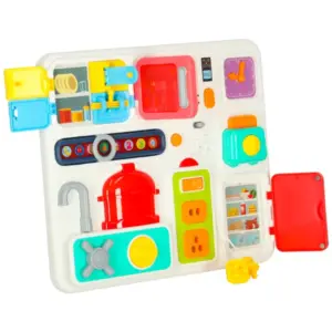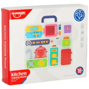 Hordozható, bőröndös fejlesztő tábla konyhás szerepjátékhoz, amely tekerőkkel, nyitható részekkel, órával és fény-hang hatásokkal köti le a gyermeket. Segíti a finommotorikát, a szem–kéz koordinációt és az önálló felfedezést, így otthon és utazás közben is tartalmas elfoglaltság.