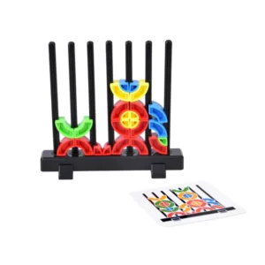 Szivárványos, fa alapra építhető geometriai puzzle, amely 72 színes blokkot és 30 mintakártyát tartalmaz. A gyermekek a pálcikákra csúsztatva alkothatnak egyszerű formáktól a bonyolult képekig, miközben észrevétlenül tanulnak.