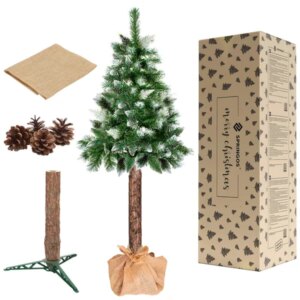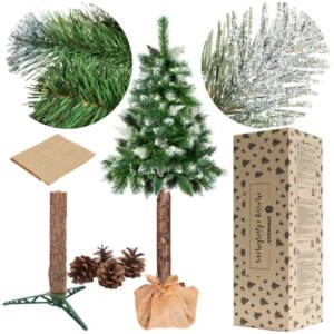 Élethű, 140 cm magas műfenyő valódi fa törzsön, havas-csillogó ágvégekkel és tobozokkal; stabil állvánnyal és jutaborítással érkezik, hogy pár perc alatt profi ünnepi dekorációt varázsolj.