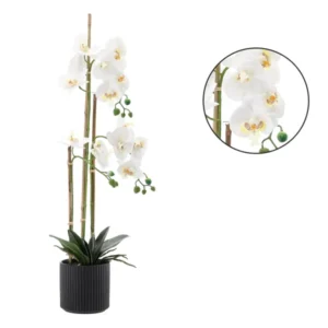 Varázsolj természetközeli hangulatot otthonodba ezzel a kifinomult, fehér színű műorchideával, amely minden évszakban ragyogóan mutat és gondozást sem igényel.
