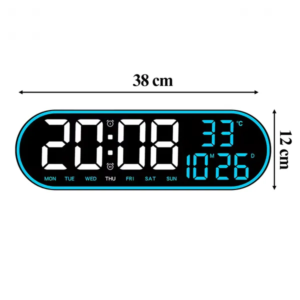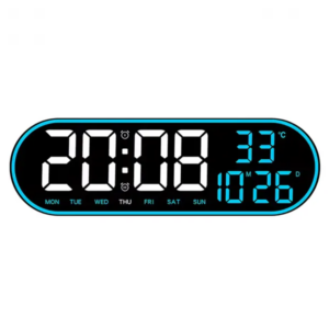 A 38 cm-es ovális LED falióra egyszerre mutatja az időt, dátumot, hőmérsékletet és páratartalmat, így egy pillantással mindent látsz. Kényelmesen szabályozhatod a mellékelt távirányítóval, a két ébresztő pedig garantálja, hogy mindig időben indulj.
