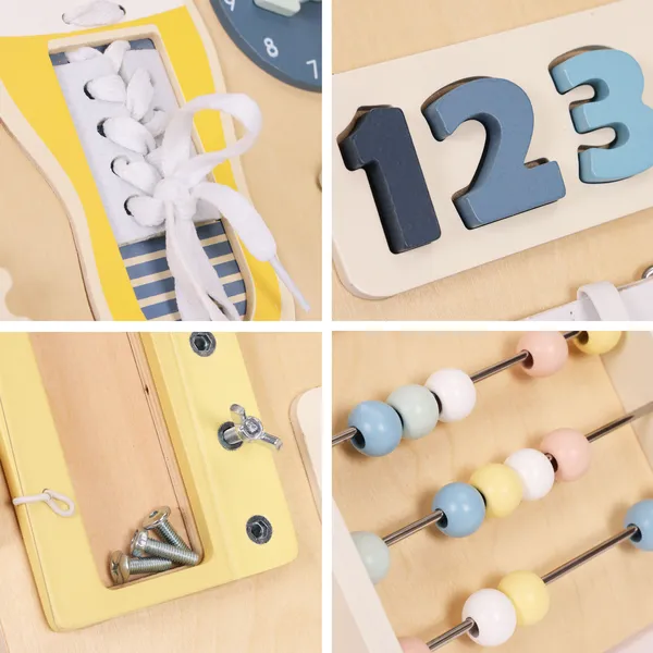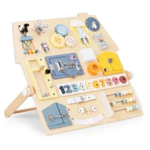 20-nál is több interaktív fa elem – cipőfűző, zárak, abakusz, fogaskerekek – fejleszti a finommotorikát és a logikus gondolkodást. A stabil, dönthető állvány kényelmes és biztonságos játékasztallá teszi a táblát a 3+ éves gyerekek számára.