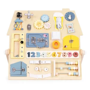 Az ECOTOYS extra nagy, szabadon álló fa busy board házikó 62,5×44×37,5 cm-es méreteivel minden nap új felfedezésre hívja a 3 évesnél idősebb gyermekeket. A több mint húsz mozgatható vagy kinyitható elem játékosan gyakoroltatja a finommotorikát, az ok–okozati gondolkodást és az önállóságot.