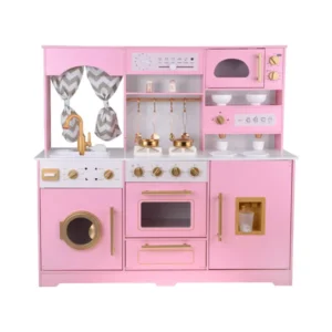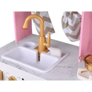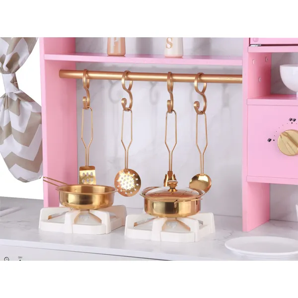 Nagy interaktív rózsaszín fa gyerekkonyha márványhatással, arany kiegészítőkkel