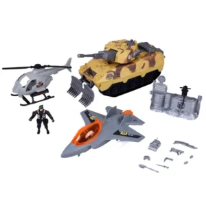 A katonai játékszett igazi akcióval tölti meg a gyerekszobát: a csomagban tank, helikopter, vadászgép és egy mozgatható végtagú katonafigura is található, hogy a küldetések mindig izgalmasak legyenek. A járművek több mozgó elemmel készültek, így a játék dinamikus, kreatív és könnyen kezelhető a kisebb kezek számára is.