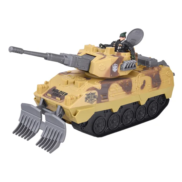• Tank tolólappal, forgatható toronnyal, nyitható búvónyílással (a figurának) és fel-le mozgatható lövegcsővel.