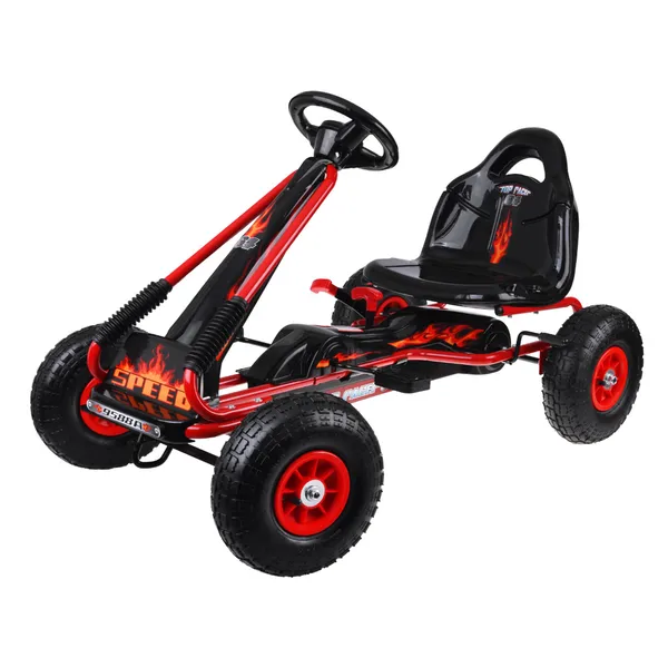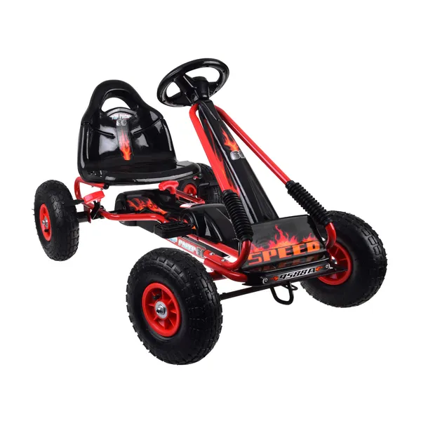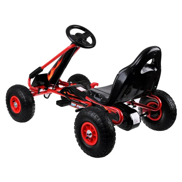 A nagy, pedálos gokart tökéletes társ a szabadtéri kalandokhoz: strapabíró acél váz, sportos kormány és csendes, felfújható gumikerekek gondoskodnak a kényelmes, biztonságos gurulásról.