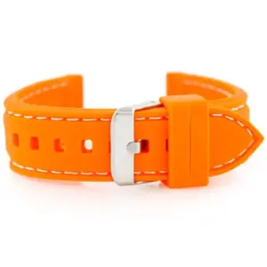 Narancssárga gumióraszíj fehér varrással, amely sportos és jól látható megjelenést ad az órának.