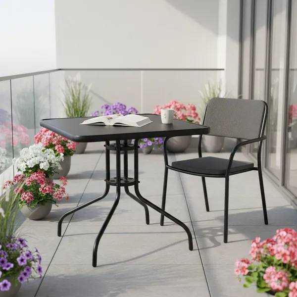 Ez a 80×80 cm-es, négyszögletes kerti asztal praktikus és időtálló választás erkélyre, teraszra vagy a kertbe. Az edzett üveg asztallap elegáns megjelenést ad, miközben jól bírja a mindennapi használatot és a kültéri körülményeket. A porszórt acél váz stabil tartást biztosít, a napernyőnyílás pedig kényelmes árnyékos pihenőhelyet teremt a meleg napokon.