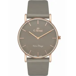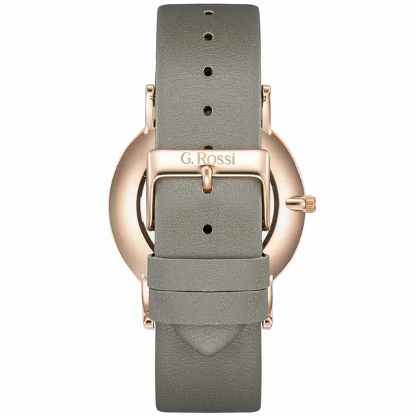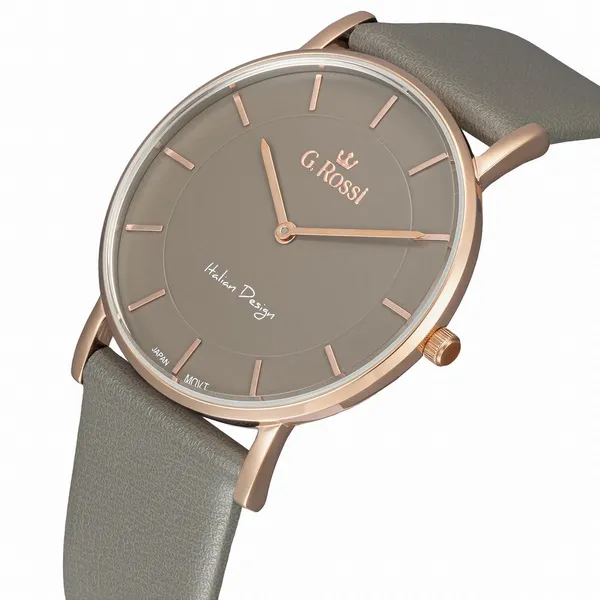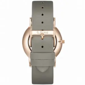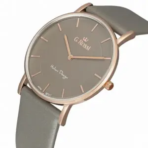 A G. Rossi női karóra elegáns választás a mindennapokra, amely a nőies megjelenést praktikus kialakítással ötvözi. A szürke természetes bőrszíj, a szürke számlap és a rózsaarany színű tok harmonikus, kifinomult összhatást teremt. A számlapon elhelyezett rózsaarany színű indexek finom csillogást adnak az órának, így könnyen illeszkedik hétköznapi és alkalmi öltözékhez is.
