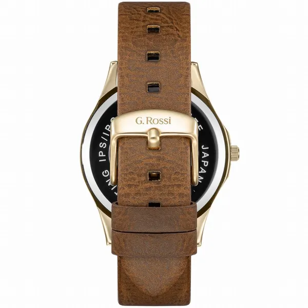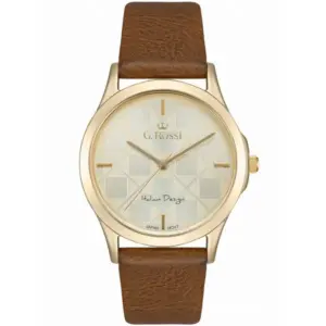 A G. Rossi női karóra elegáns választás mindennapi viseletre, amely finom nőies megjelenést és praktikus használhatóságot kínál. A barna természetes bőrszíj, az aranyszínű tok és az arany számlap harmonikus összhatást teremtenek, így az óra könnyen illeszkedik hétköznapi és alkalmi öltözékhez is. Az arany indexek tovább erősítik a kifinomult megjelenést.