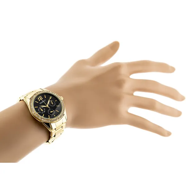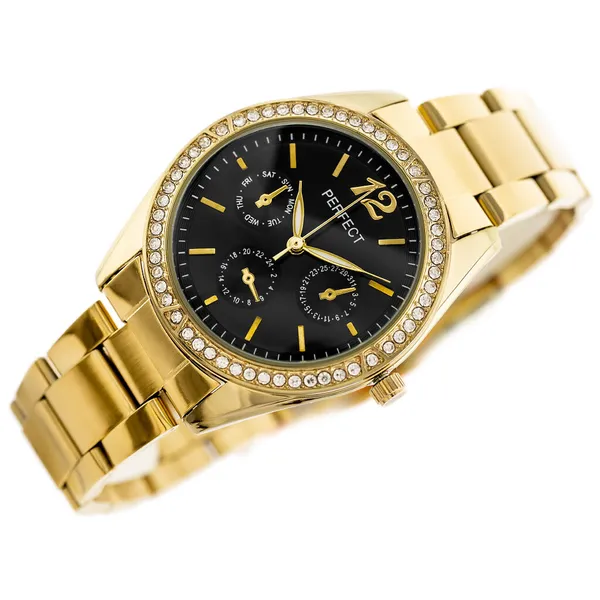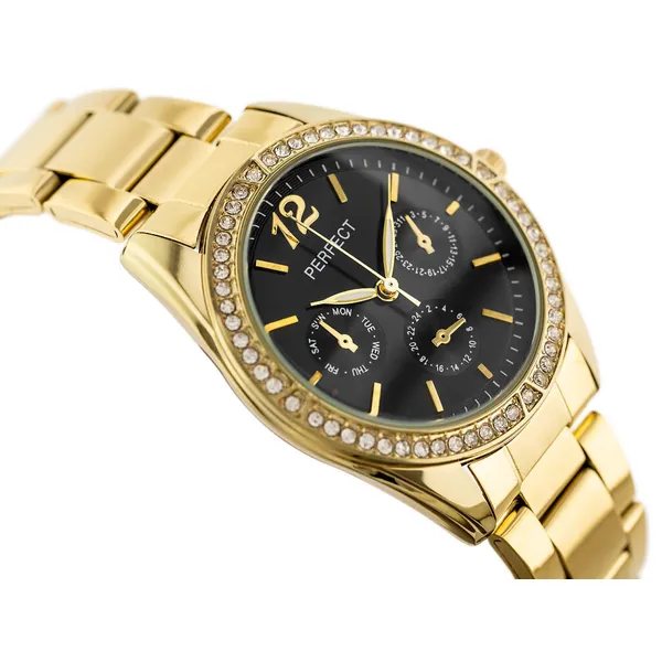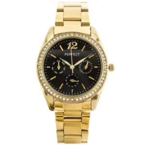 Elegáns női кварc karóra letisztult, kerek számlappal és aranyszínű fém szíjjal. A fekete számlap és az aranyszínű tok időtálló, nőies megjelenést ad, így a modell mindennapi viselethez és alkalmi öltözékhez is kiváló választás.