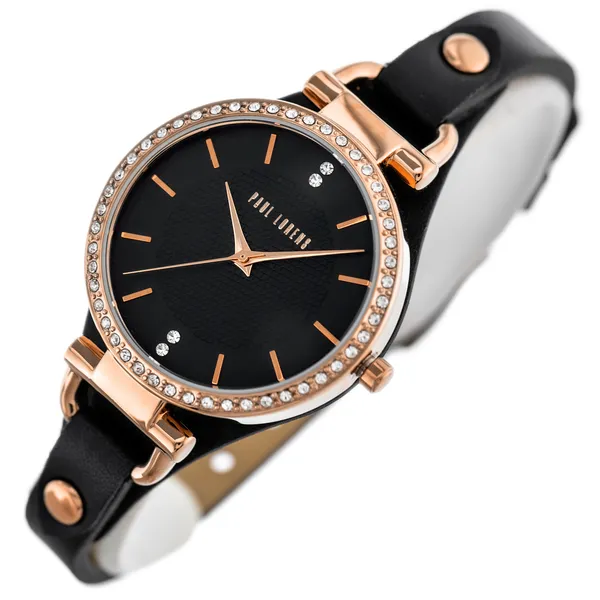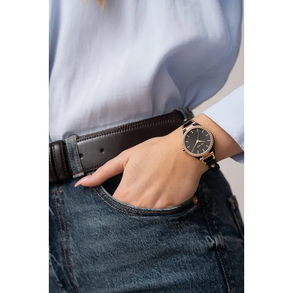 Elegáns női karóra fekete számlappal és rózsaarany színű, cirkóniával díszített tokkal – ideális választás mindennapi viselethez és alkalmakra is. A gondos kidolgozás, a letisztult arányok és a divatos részletek könnyen kombinálhatók üzleti, casual vagy esti szettekkel.