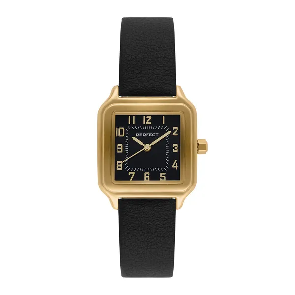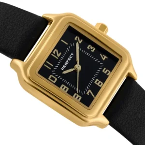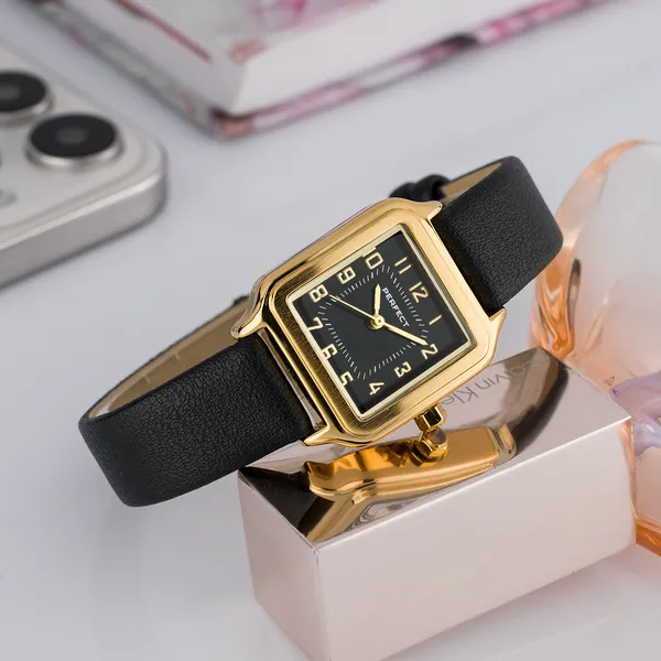 Ez a női karóra megbízható, pontos japán kvarc szerkezettel készült, így ideális választás a mindennapokra és elegáns alkalmakra is. Az aranyszínű tok és a fekete számlap letisztult, jól kombinálható megjelenést ad, a fekete szíj pedig kényelmes viseletet biztosít.