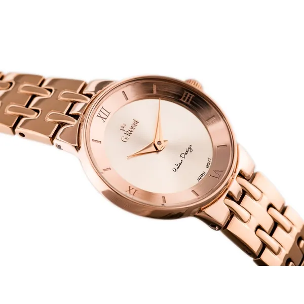 Elegáns rózsaarany kivitelével könnyen kombinálható a mindennapi és alkalmi öltözékekkel, miközben a japán szerkezet megbízható működést biztosít. Az antiallergén bevonat, az ásványi üveg és a fém szíj tartós, kényelmes viseletet nyújt.