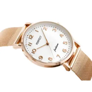 Elegáns, vékony kialakítású női karóra rózsaarany fémhálós szíjjal és ezüst számlappal, amely könnyen illik hétköznapi és alkalmi öltözékhez. A japán кварc szerkezet pontos működést, az ásványi üveg pedig megbízható védelmet nyújt a mindennapokban.