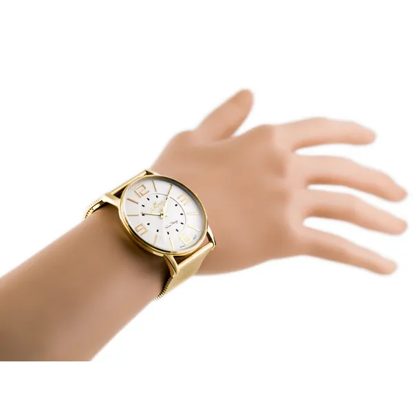 Elegáns, női karóra aranyszínű fémszíjjal és ezüst számlappal, amely a japán MIYOTA Citizen kvarc szerkezetnek köszönhetően mindig pontos.