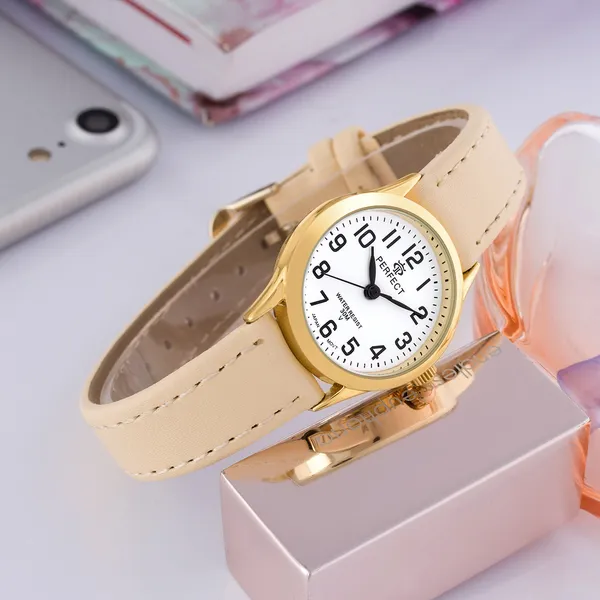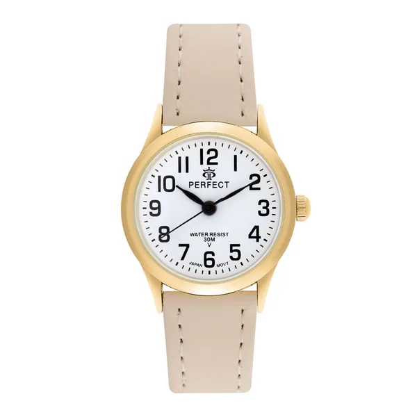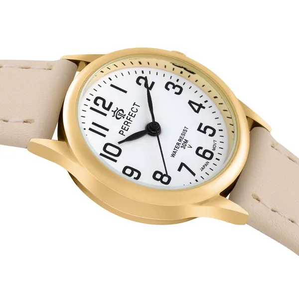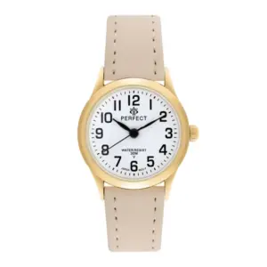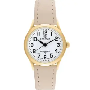 Elegáns női karóra aranyszínű tokkal és letisztult fehér számlappal, amely kiváló választás mindennapi viselethez és alkalmi megjelenéshez is. A klasszikus színösszeállítás könnyen kombinálható különböző öltözékekkel, így időtálló kiegészítője lehet ruhatárának.