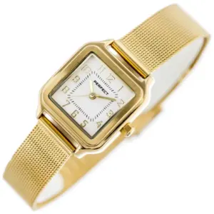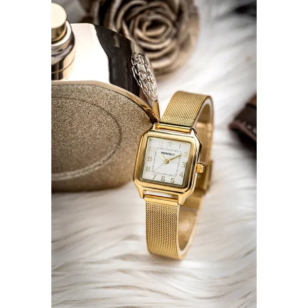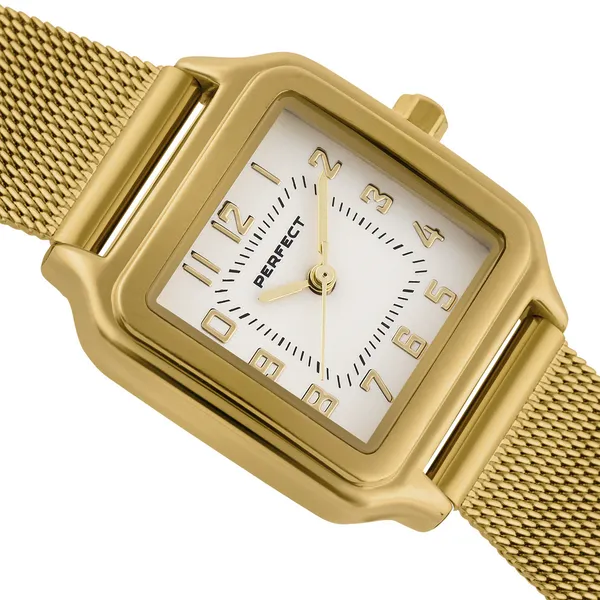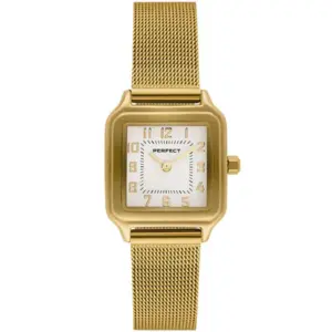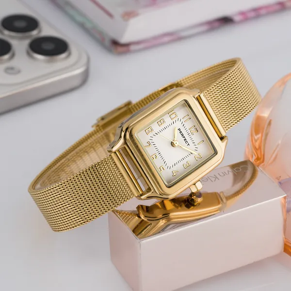 A Perfect női karóra elegáns, letisztult megjelenésével ideális választás mindennapi viseletre és alkalmi öltözékhez is. A fehér számlap, az aranyszínű tok és a hozzá illő aranyszínű fémszíj harmonikus összhatást teremt, így könnyen kombinálható különböző stílusokkal.