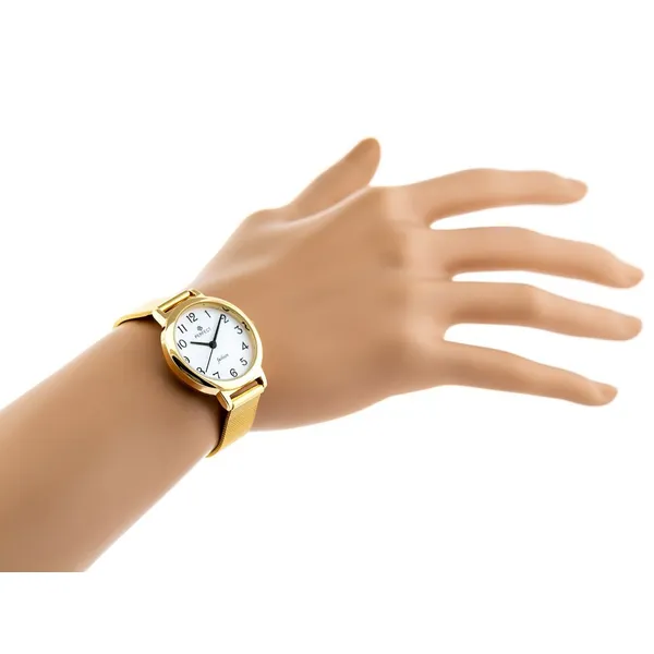 Elegáns, aranyszínű női karóra, amely kényelmes fém szíjjal és pontos кварc szerkezettel támogatja a mindennapi használatot. Karcsú kialakítása, jól olvasható számlapja és fröccsenés elleni védelme praktikus választássá teszi munkához és alkalmi viselethez is.