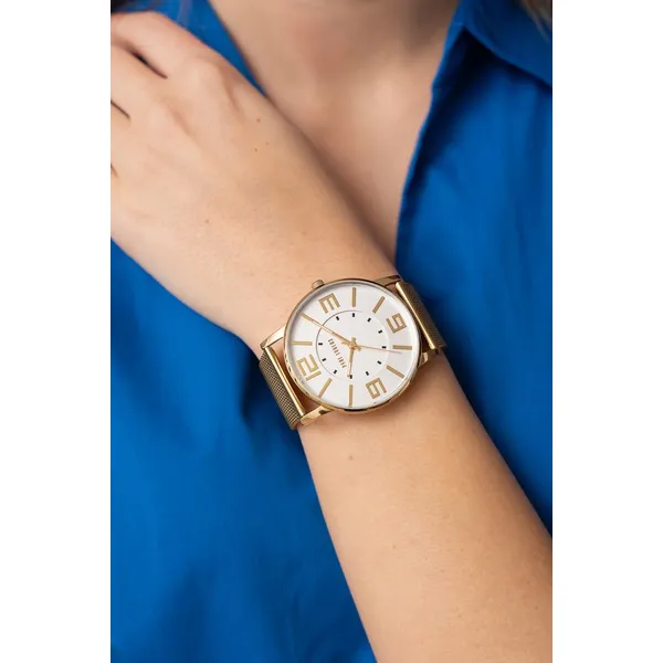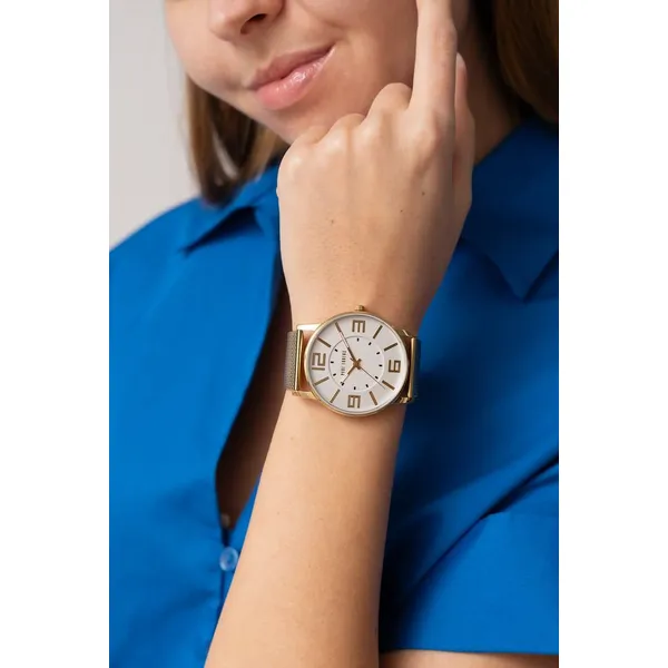 Válaszd az eleganciát és a megbízhatóságot egyetlen ékszerben: ez a női karóra arany színű, IPG bevonattal ellátott rozsdamentes acél tokkal és légies mesh szíjjal készült, így nemcsak kifinomult megjelenést, hanem hosszan tartó kényelmet kínál.