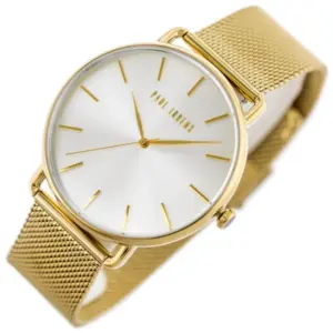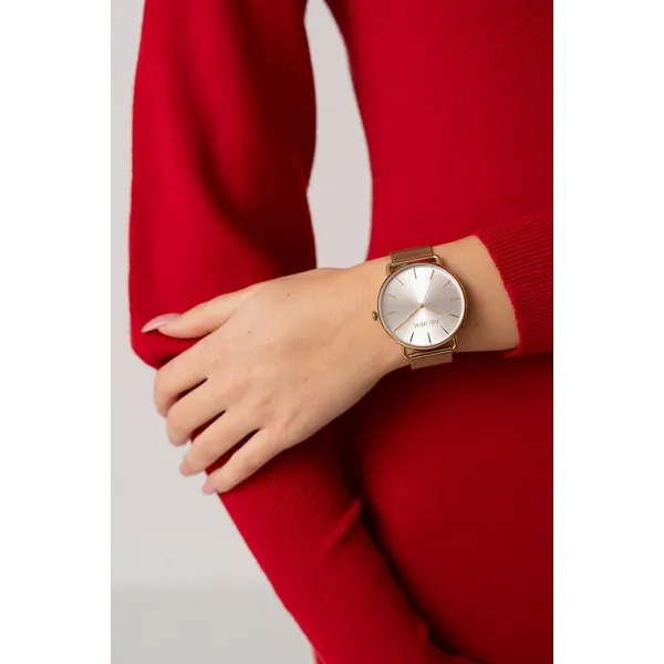 Elegáns, aranyszínű női karóra ezüst számlappal, amely könnyen kombinálható mindennapi és alkalmi öltözékekhez. Antiallergén bevonata és kényelmes acél szíja egész napos, komfortos viseletet biztosít.