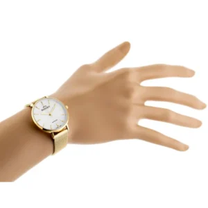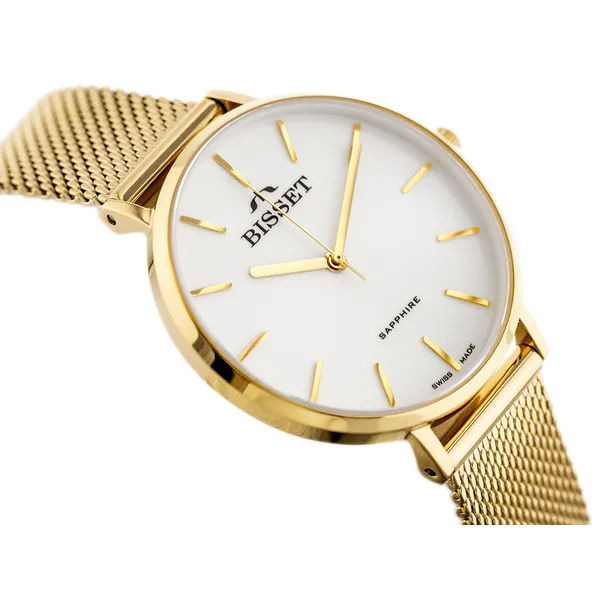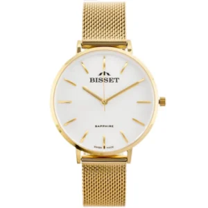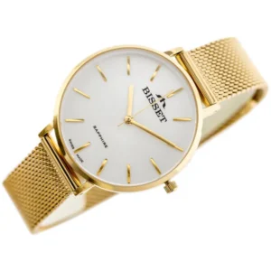 Az elegáns Bisset BSBF32 női karóra svájci Ronda kvarc szerkezettel működik, amely megbízható időmérést garantál. A polírozott, aranyszínű rozsdamentes acél tok és szíj hipoallergén bevonattal készült, így érzékeny bőrön is kényelmes viselet.