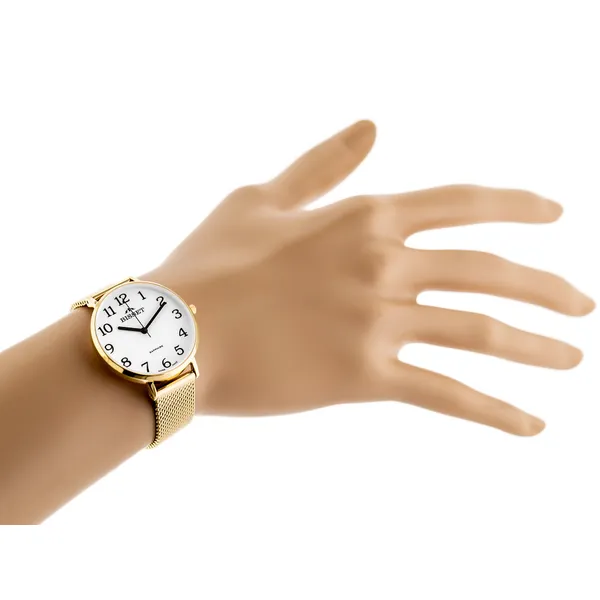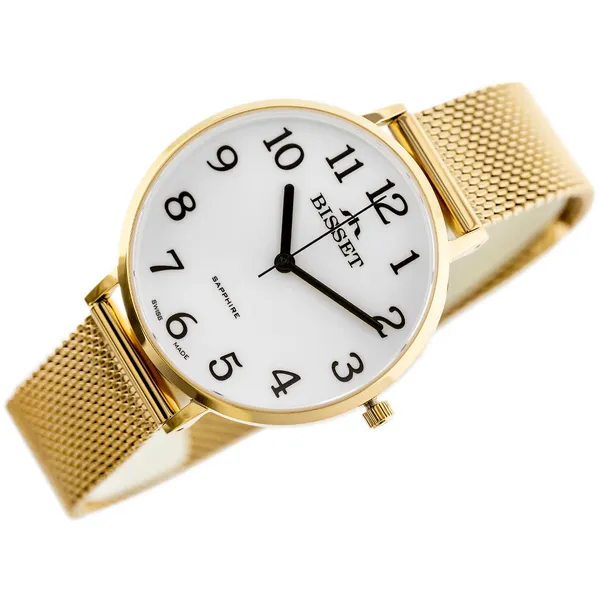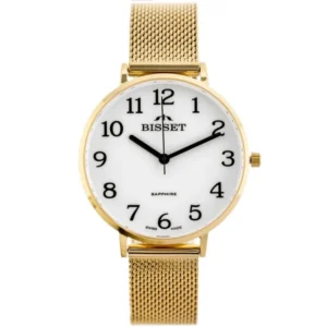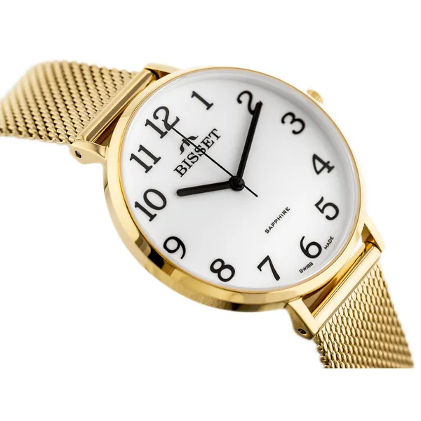 Ha egy időtállóan elegáns, svájci minőségű női karórára vágysz, a BISSET BSBF32 tökéletes választás: aranyszínű, finoman ívelt nemesacél tokozása és bransóletta, karcálló szafírüveg, valamint megbízható Ronda kvarc szerkezet gondoskodik a mindennapi kifogástalan megjelenésről.