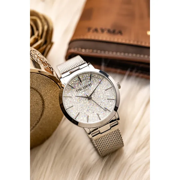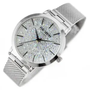 Elegáns, ezüstszínű női karóra rozsdamentes acél hálós szíjjal, amely kényelmesen állítható és kifinomult megjelenést ad. A japán kvarc szerkezet, az ásványi üveg és az ajándék díszdoboz praktikus, stílusos választássá teszi.