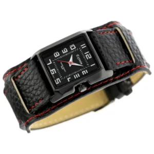 Japán Miyota kvarc szerkezettel készült női karóra, amely pontos járást és megbízható mindennapi használatot ad. A fekete téglalap tok, az ásványüveg és a piros varrással díszített kényelmes textilszíj elegáns, mégis karakteres megjelenést biztosít.