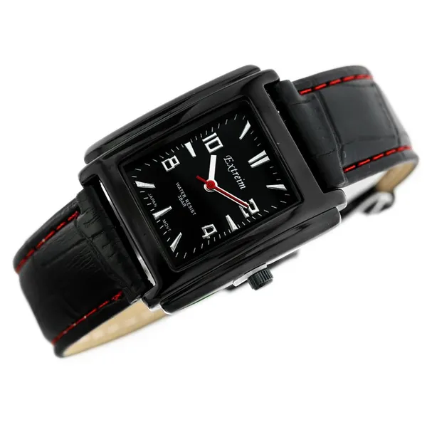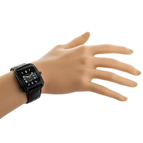 A fekete szövet szíjat piros varrás díszíti, amely karakteres megjelenést kölcsönöz az órának. A téglalap alakú tok modern és nőies választás, a minerálüveg pedig segít megóvni a számlapot a mindennapi használat során.