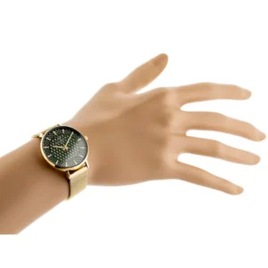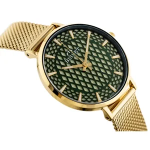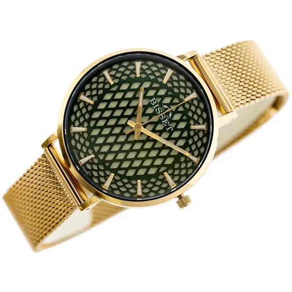 Elegáns, svájci minőségű Bisset BSBF32 női karóra, amelyet az időtlen arany nemesacél tok és bransó, valamint a mélyzöld, mintázott számlap tesz különlegessé. A zafírkristály üveg kimagasló karcállóságot biztosít, míg a RONDA Swiss quartz szerkezet megbízható pontossággal működik. WR30 vízállósága a mindennapi fröccsenő víz ellen is véd. Antiallergén bevonata érzékeny bőrön is kényelmes viselet.