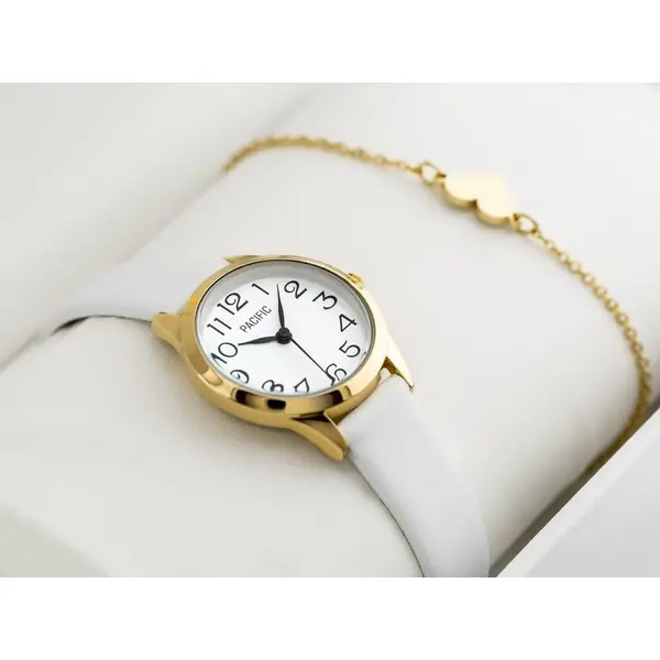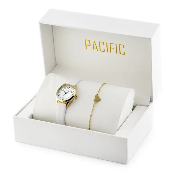 Elegáns ajándékszett megbízható japán MIYOTA кварц szerkezettel és antiallergén IPG bevonattal a kényelmes viseletért. Fehér, gyöngyház hatású számlapja és arany színű tokja alkalmakra is stílusos, a csomag pedig díszdobozt és szív charm-os csuklóláncot is tartalmaz.