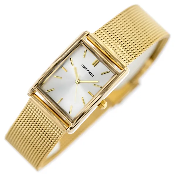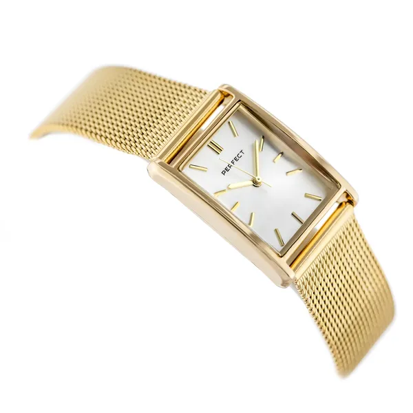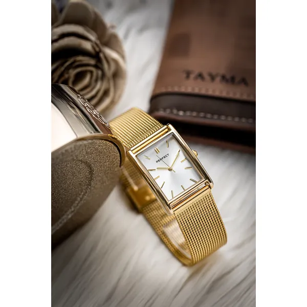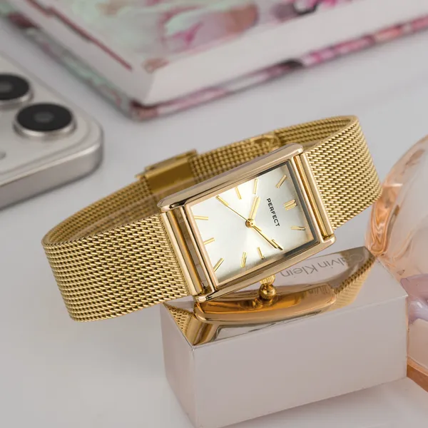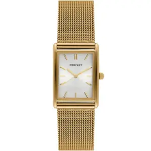 A Perfect női karóra elegáns megjelenésével és sokoldalú stílusával ideális választás a hétköznapokra és alkalmi viselethez is. Az arany színű tok és szíj, valamint az ezüst számlap harmonikus összhatást ad, így a modell könnyen kombinálható különféle öltözékekkel.