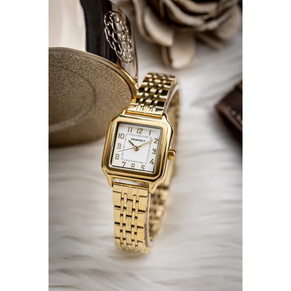A Perfect női karóra elegáns, időtálló választás a mindennapokra és alkalmi viselethez is. A fehér számlap, az aranyszínű tok és szíj harmonikus megjelenést ad, miközben a japán Miyota kvarcszerkezet pontos működést biztosít.
