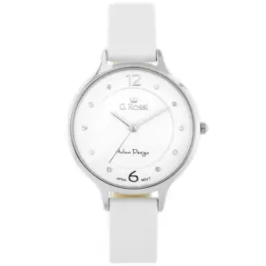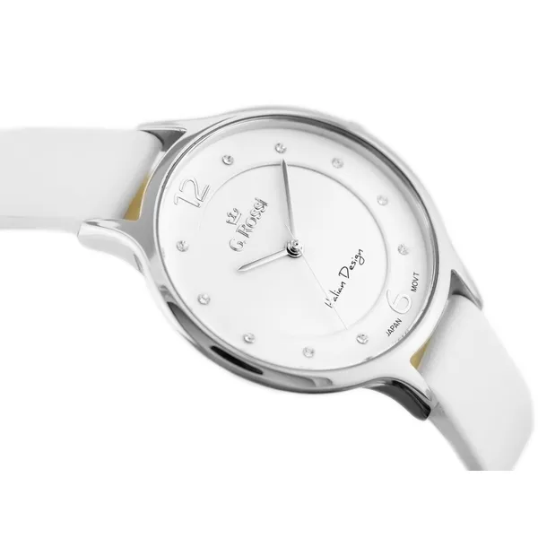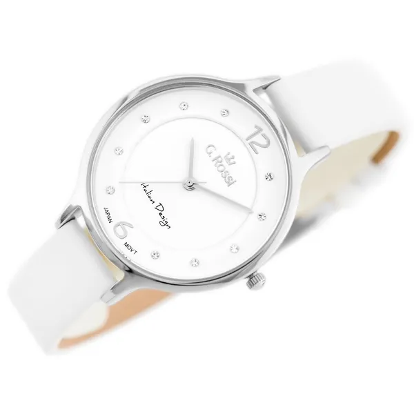 A G. Rossi női karóra elegáns és praktikus választás a mindennapokra. A fehér természetes bőrszíj, az ezüstszínű tok és a fehér számlap harmonikus, kifinomult megjelenést ad, amely jól illik hétköznapi és alkalmi öltözékhez is. A számlapon elhelyezett finom kristályos indexek diszkrét csillogást kölcsönöznek az órának, így nőies és stílusos kiegészítővé teszik.