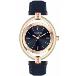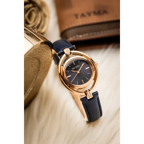 Az időtálló dizájn klasszikus részleteket kapcsol össze modern megjelenéssel, így a karóra könnyen illeszkedik különböző öltözékekhez. A sötétkék számlap és bőrszíj, valamint a rózsaarany színű tok harmonikus, nőies összhatást teremtenek.