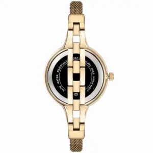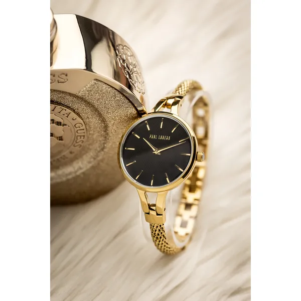 Az óra rozsdamentes acélból készült, arany színű kivitelben. A keskeny, finom szíj tökéletesen illeszkedik a kerek fém tokhoz, míg a fekete számlap elegáns kontrasztot teremt. A mutatók és indexek visszafogott, nőies megjelenést adnak az órának. A számlapot ásványi üveg védi, amely segít megóvni a felületet a mindennapi használat során keletkező kisebb sérülésektől.
