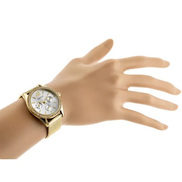 Nőies, elegáns megjelenés a mindennapokra és alkalmi viselethez is. Ez a női kvarc karóra aranyszínű tokkal és fém szíjjal, valamint ezüst színű számlappal készült, így könnyen kombinálható különféle öltözékekkel. A japán gyártású kvarc szerkezet pontos működést biztosít, a minerálüveg pedig segít megóvni az órát a hétköznapi használat során.