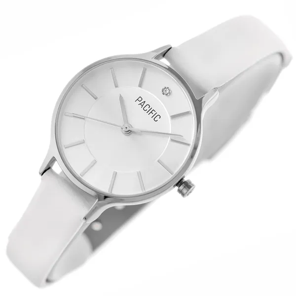 Ez a női karóra elegáns, letisztult megjelenésével remek választás ünnepi alkalmakra és mindennapi viseletre is. A kerek tok, az ezüstszínű számlap és a fehér bőrszíj harmonikus, nőies összhatást teremt.