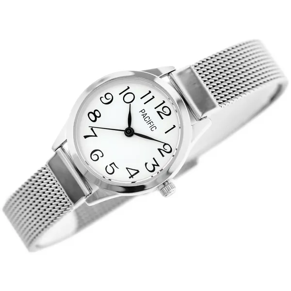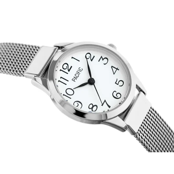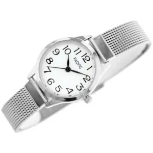 Elegáns, könnyen kombinálható női karóra állítható ezüstszínű hálós szíjjal és jól olvasható fehér számlappal. Kényelmes viselet a mindennapokra, ajándéknak is remek választás díszdobozos csomagolásban.