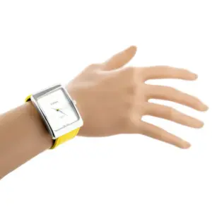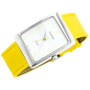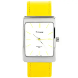 Stílusos női karóra modern, téglalap alakú tokkal és friss, figyelemfelkeltő színvilággal. A fehér számlap, az ezüst színű tok és a sárga szövet szíj együtt elegáns, mégis egyedi megjelenést ad a mindennapokra.
